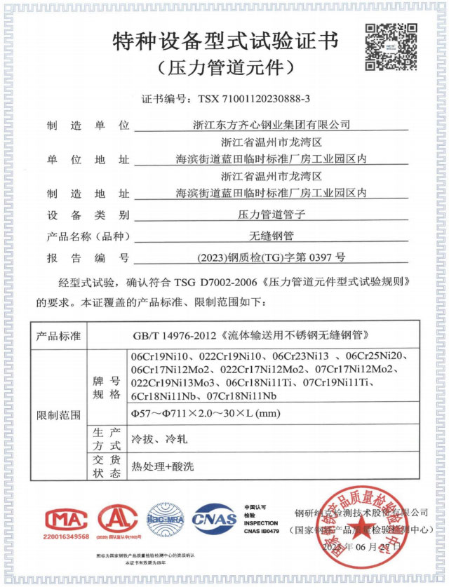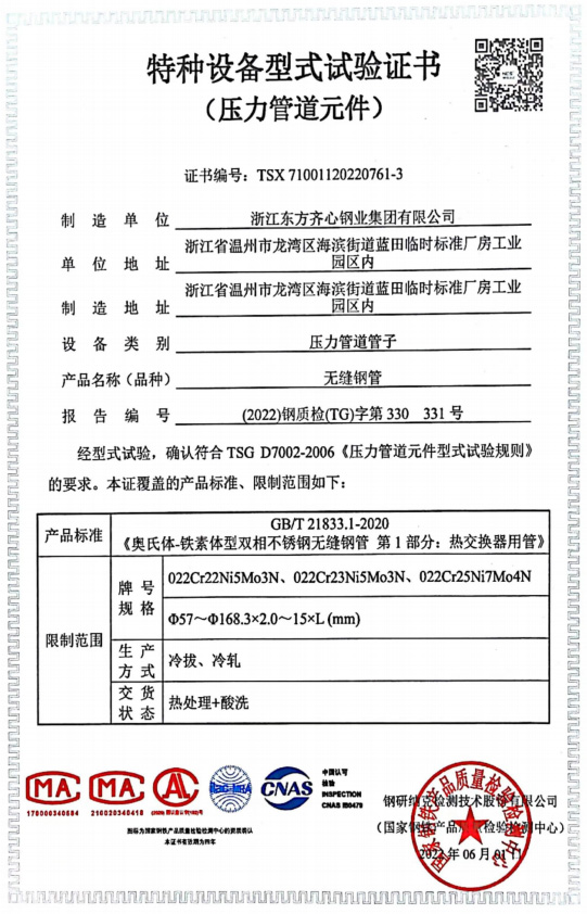 浙江東方齊心以不銹鋼系列產(chǎn)品為主導(dǎo),品種有不銹鋼管、奧氏體不銹鋼管、高溫合金鋼管、雙相不銹鋼管、鎳基合金管、冷凝器用管、U形管、核電管、不銹鋼管件、法蘭、閥門等。規(guī)格有6-2020x0.8-60mm,Ф16-25長度可達(dá)33m。公司擁有精密制造鋼管的各類機(jī)械設(shè)備25臺(套),其中各類冷軋管機(jī)15臺, 冷拔機(jī)10臺,天然氣熱處理爐2套。